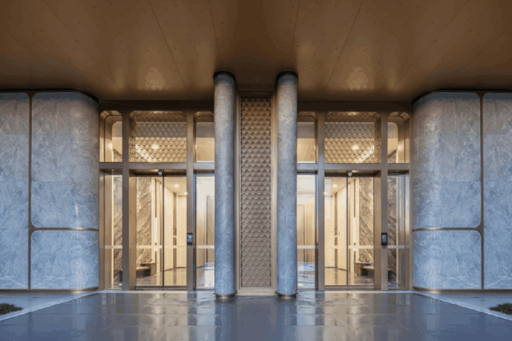天琴樾的产品有多迭代?单外立面就足够出类拔萃。与传统住宅立面普遍使用涂料、面砖,千篇一律、缺乏设计感不同,天琴樾以爱马仕灰及其他石材结合香槟色铝板做底部造型,米白及灰色多彩漆为整体颜色搭配,加上通透的大面积玻璃界面,整体既显奢华大气,又不失灵动,成为辨识度极高的地标建筑!