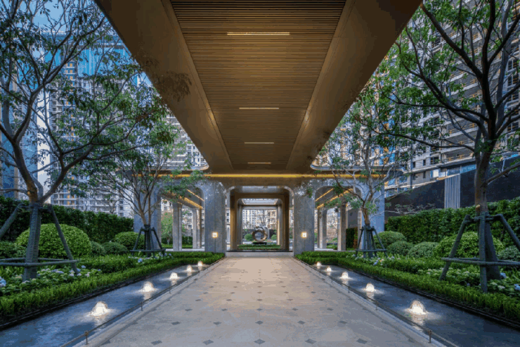 当代城央豪宅更强调 “领地感”,既有资源也有专属感。就如天琴樾,在城东核芯之上做加法,小区外部围了 约1300米绿化带,竖起名为「领地」无形的墙,内嵌 最大近百米楼间距、约1.6万㎡的大中庭,构建出 七大沉浸式场景,这种内外双园的高端构造在城东是相当罕见的。