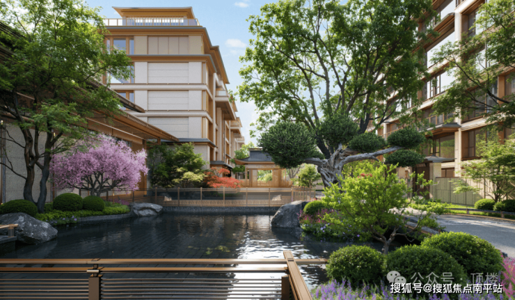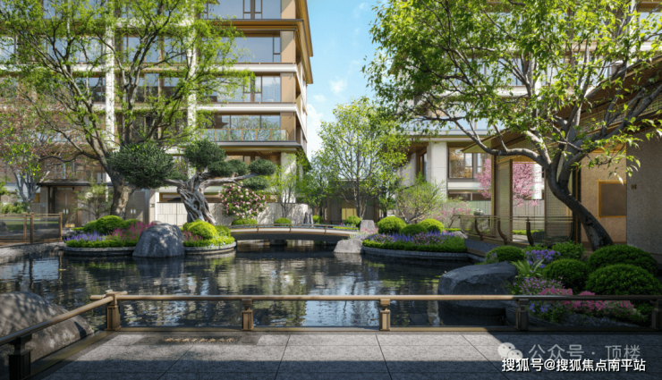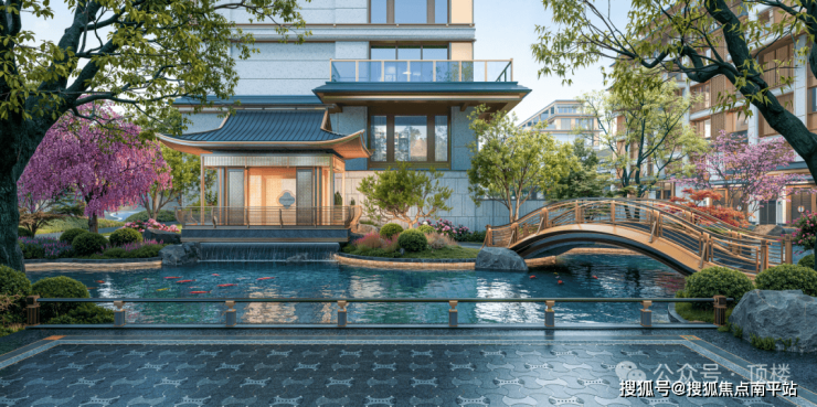 红线外滨河的重金投入:璟园以约500米滨水步道贯穿南北双地块,形成「一轴一环两园」的生态格局。这条滨水脉络不仅是社区的景观中轴,更通过四大主题空间(垂钓台、亲水步道、水榭茶寮、观景平台)与园林十六景深度联动,让「出门见河、推窗见景」成为日常。