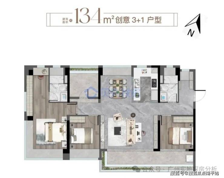 134方四房两卫,长8.2米宽1.9米阳台,主卧33平方,南望江北瞰园,5.3米奢阔复合厅,奢配270°瞰景大飘窗。