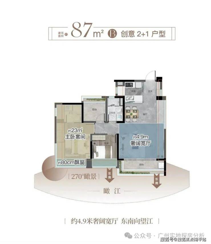 87B平三房两卫,罕有约4.9米宽幕客厅,110%使用空间,约23㎡ 酒店套房式主卧,央景中轴。