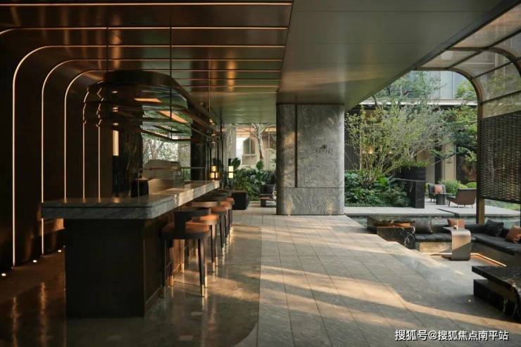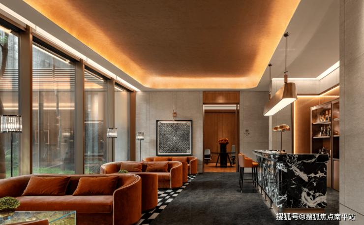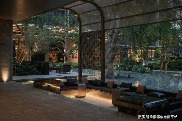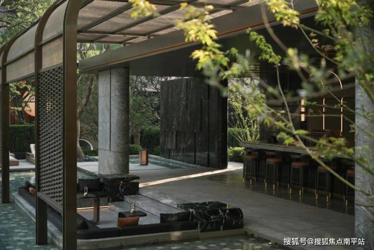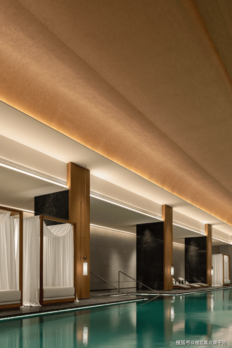 展示区部分即泛会所景观,泛泳池作为社区的心脏。泛泳池的中央位置,设计了一座高端户外酒廊(Whiskey Bar),为业主提供一个雅致的社交场所,在泛泳池上,配置酒廊餐吧、水吧、花园洽谈、滨水休闲等。在泛泳池周围,翠绿的植被与泳池SPA躺椅相得益彰。业主将在此有各式的方式休闲。