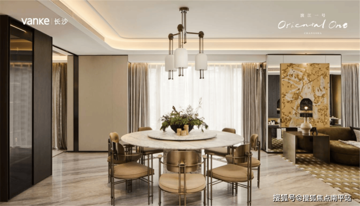 外立面采用香槟金铝板搭配270°弧形转角玻璃幕墙, 突破超高层住宅锐利直角的传统做法,且所有玻璃幕墙拐角处都做出弧度,打造少有的全景舱视野不仅赋予建筑以通透灵动的气质,更让每一道光线流畅穿梭,勾勒出无与伦比的流线美感。