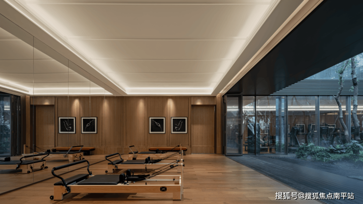 在约1200平的下沉空间打造了三个核心功能空间——健身房、普拉提室、泳池。三个空间围绕下沉庭院展开,四季时景透过横厅渗透室内,赋予空间高级感、自然感、松弛感。