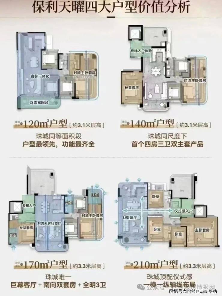 保利天曜分为南、北两个地块,北地块规划3栋塔楼,均为全南向布局;南地块规划7栋住宅楼,采用2梯2户的南北对流的全板楼设计。整个项目容积率仅3.33,住宅总数约940套。