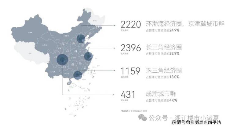 截至2024年6月30日,已覆盖128个城市,合约总建筑面积达122.8百万㎡,可售货值约8920亿,主要经济区占比约75.5%。