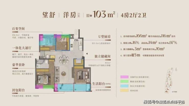 作为最大卖点,建发国贸·望樾依托新的建筑规范政策,通过阳台、飘窗、设备平台全赠送,综合得房率达到97%-103%。以103㎡户型为例,套内使用面积就达到约100㎡,媲美传统116㎡高层套内空间。