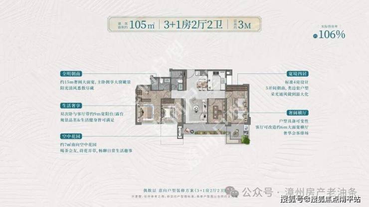 105平做四房房客厅面宽约3.4米,做三房客厅约5.8米,层高3米