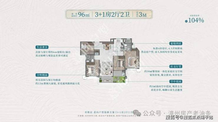 96平做四房客厅面宽约3.2米,做三房客厅约5.9米,层高3米
