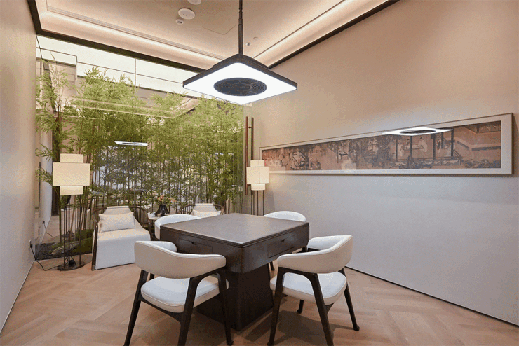 【落笔堂】内部,健身、餐饮、会客、私宴与棋牌五大功能有序展开,全落地玻璃窗如通透的景框,彻底消弭室内外的视觉边界,让庭院绿意与功能场景无界渗透。