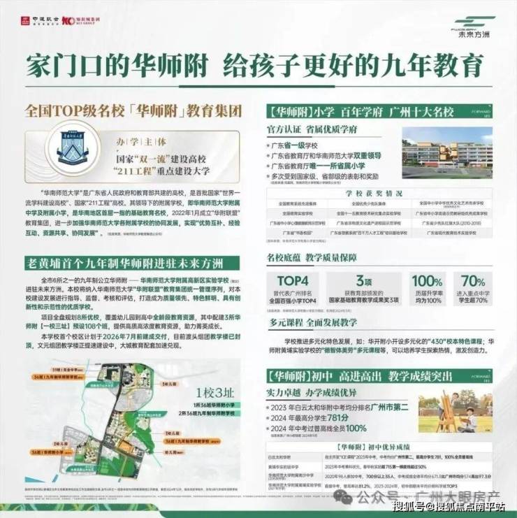 未来方洲楼下就有一所12班的幼儿园,一所36班的九年一贯制学校,可以做到目送式的接送方式,这所学校将引入老黄埔首个9年制“华师附”教育体系,现在已经正式官宣