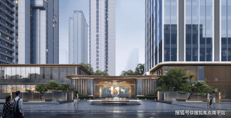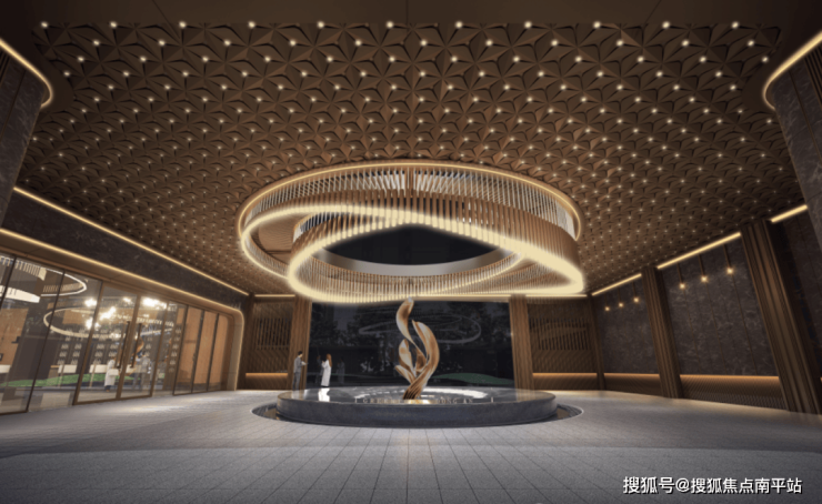 呼应浏河的流水形态,以星耀灰奢石材融合深香槟色铝板,勾画与街区一体的奢尺恢弘门庭,一处庭前星空顶大堂“车马院”,俨然一座高星级酒店入口,名门风范不彰自显。