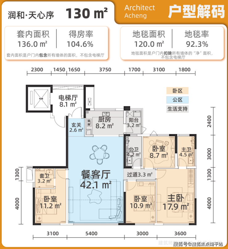 130㎡户型同样是四房三卫,客餐厅、主次卧各个空间尺寸更大,得房率在所有户型中最高,达到了104.6%,套内使用面积约136㎡,居住舒适度更加nice~