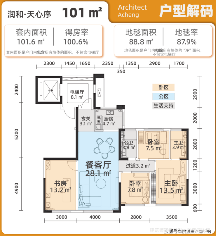 最小的101㎡户型,设计为四房两厅两卫,做到了四开间朝南,客厅开间4米,主卧开间3.5米,实际得房率约100.6%。