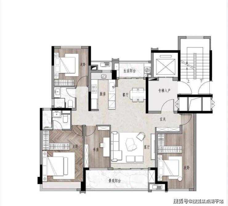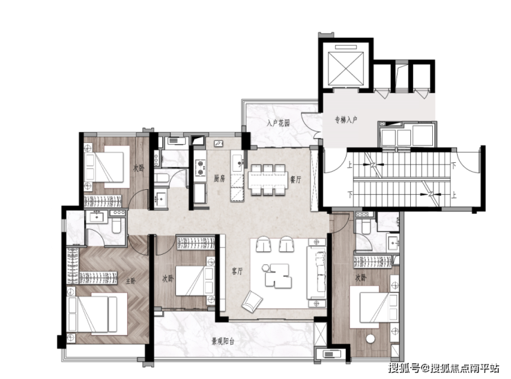 首先,是板楼设计,梯二,两梯两户,是可以真正做到专梯入户,且电梯间可以作为自己的私人空间。
