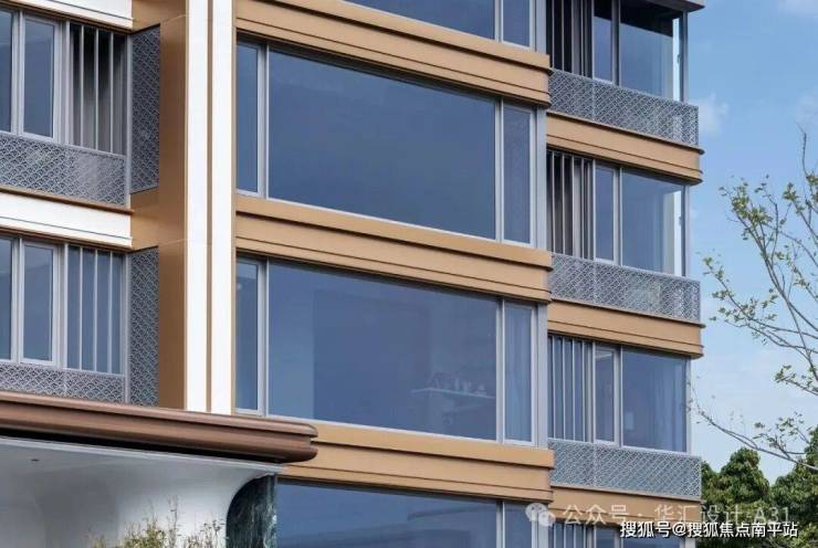 建筑立面精工雕琢,横向香槟金铝板采用整板锻造工艺,窗洞周边配以精致线脚肌理,强化立面韵律感。玻璃采用整幅开启设计,以化整为零手法对窗间墙进行玻璃一体化覆面处理,弱化实体界面。飘窗格栅提升工艺精度,并融入项目LOGO符号化设计,使建筑横向线条舒展流畅,整体质感柔和精致、现代大气。