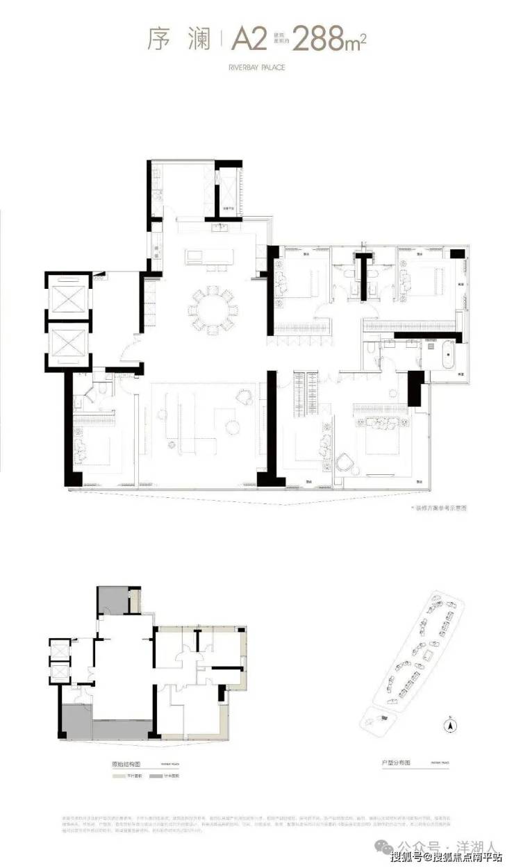 建面约288户型,是三个户型中离江最近的户型, 五房设计,超大横厅,4个房间直面湘江,其中主卧、主卫都是270度观江。