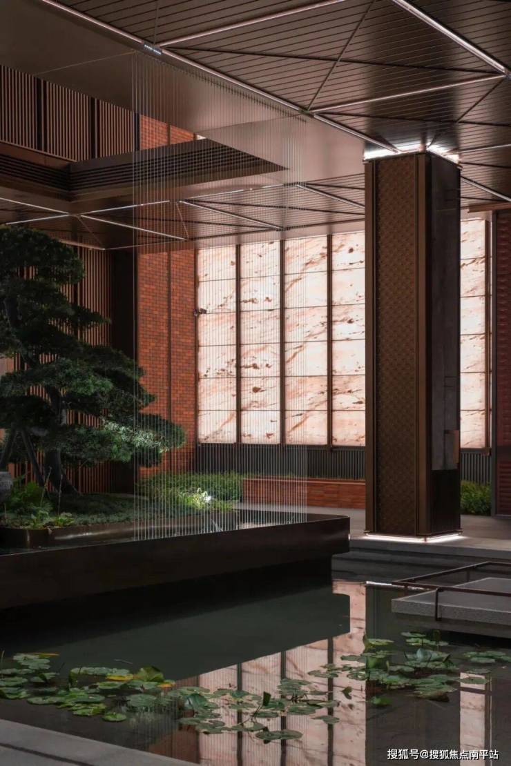 汲取闽南古厝“天井”设计的灵感,我们巧妙融合传统与现代元素,彰显出独树一帜的文化韵味。室内设计中,屋顶内侧的坡面巧妙引流,使雨水四面八方汇聚至中庭的锦鲤池。这一巧思不仅寓意着“水聚天心”,更深刻体现了“天人合一”的哲学理念。锦鲤池畔,水幕如画轴般展开,清澈泉水细流潺潺,注入天井内的细流之中。溪流两岸,绿意盎然,山水交融,绘制出一幅层次分明、生机勃勃的画卷。整个空间宛如独立于世的禅境,静谧而古朴,散发着典雅的气息。此设计在传承传统建筑风貌的同时,注重对本土文化的诠释与传承。匠心独运的空间布局不仅迎合现代审美,更饱含地域文化的感染力。步入其中,人们即可沐浴在浓厚的闽南文化氛围中,领略一种别具一格的艺术之美。