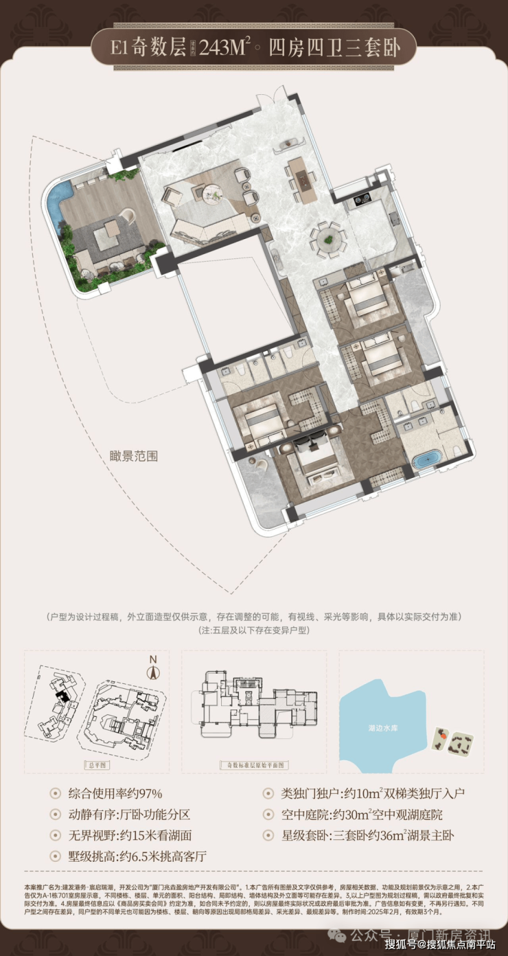 厦门湖边水库建发·宸启瑞湖,开发商销售热线:400-0592-010,售楼中心预约制。项目案场采用预约制,现场验资1000万。岛内第四代和岛外120㎡的标准是两回事。全球限量级恒产,68席湖景空中墅。