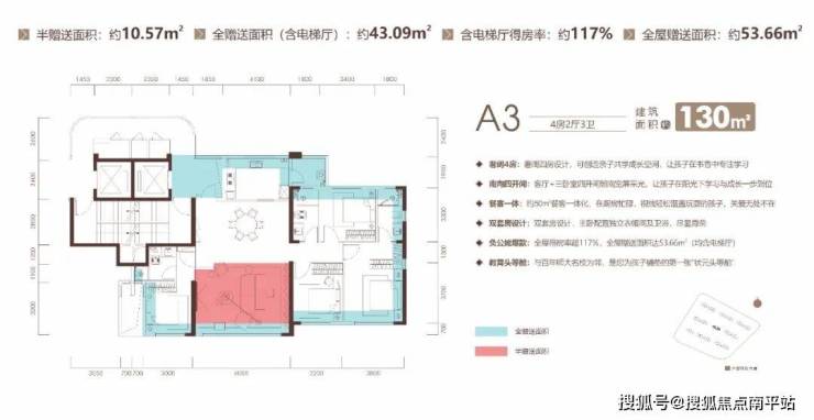 建面约130㎡四房户型,赠送面积约53.66㎡,得房率117%,实际得房媲美市面上很多约180㎡的大平层!