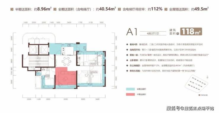 再看 建面约118㎡四房户型,赠送面积49.5㎡,得房率112%,做了双套房设计,既能满足三代同堂,又能给孩子留一间房作 “学习专属空间”,是 “改善型家庭” 的首选。