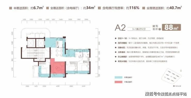 建面约88㎡户型赠送面积高达40.7㎡,得房率 116%,实际使用面积堪比传统户型的125㎡!