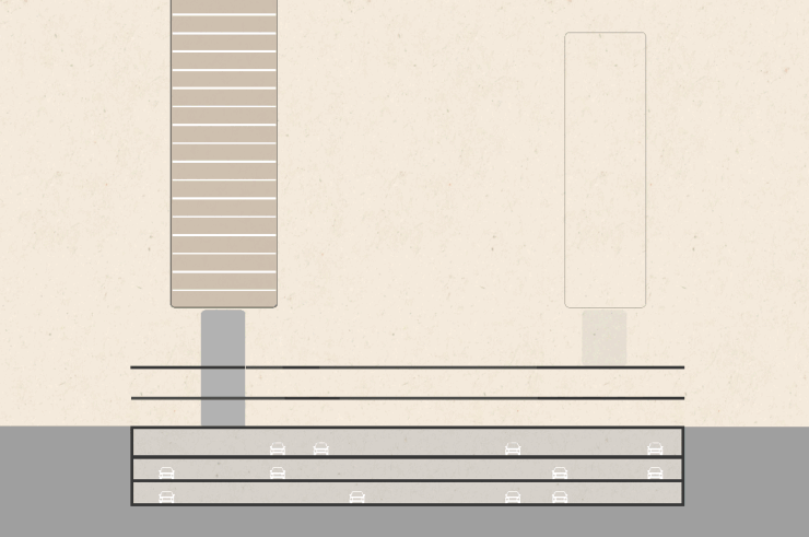 值得一提的是,首层车马院宽约 8 米,采用三车道设计,可满足“一停一备一用”,即一条道用于临时停靠,一条常规通行,另一条作为高峰与突发情况的预留通道。