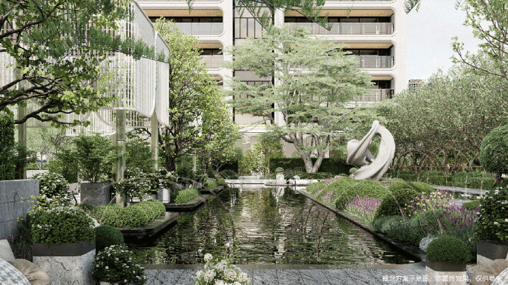 入口处,利用错落的高绿篱与精致景墙围合,营造隐奢静谧的归家前场;步入其中,两侧各列植绿柱,与柱廊倒影在水景之中,交辉呼应,形成强烈的序列感与仪式感。