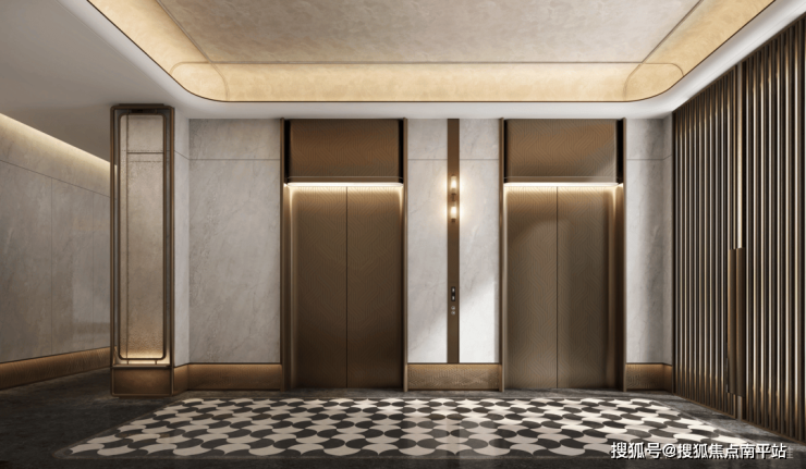 对齐当下岛内6-7万的高端新房采用的设计:豪宅同款的拼花地砖、大面的奢石背景墙、棕金框水波纹玻璃屏风、天鹅绒艺术漆打造的吊顶和天花、镌刻精美纹路的电梯门……一眼看过去,就是豪宅的感觉