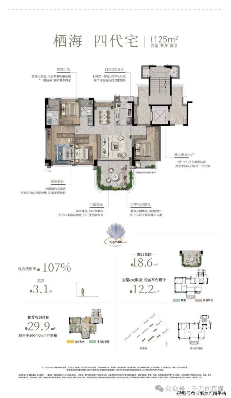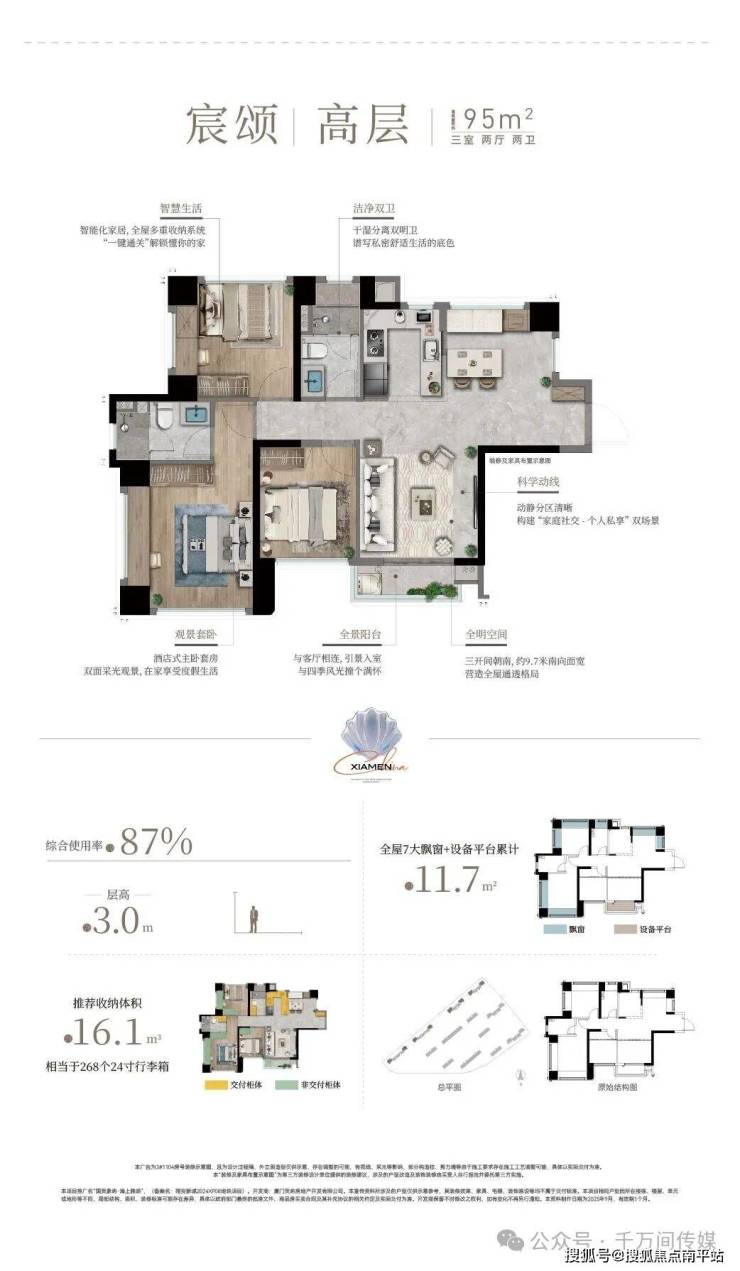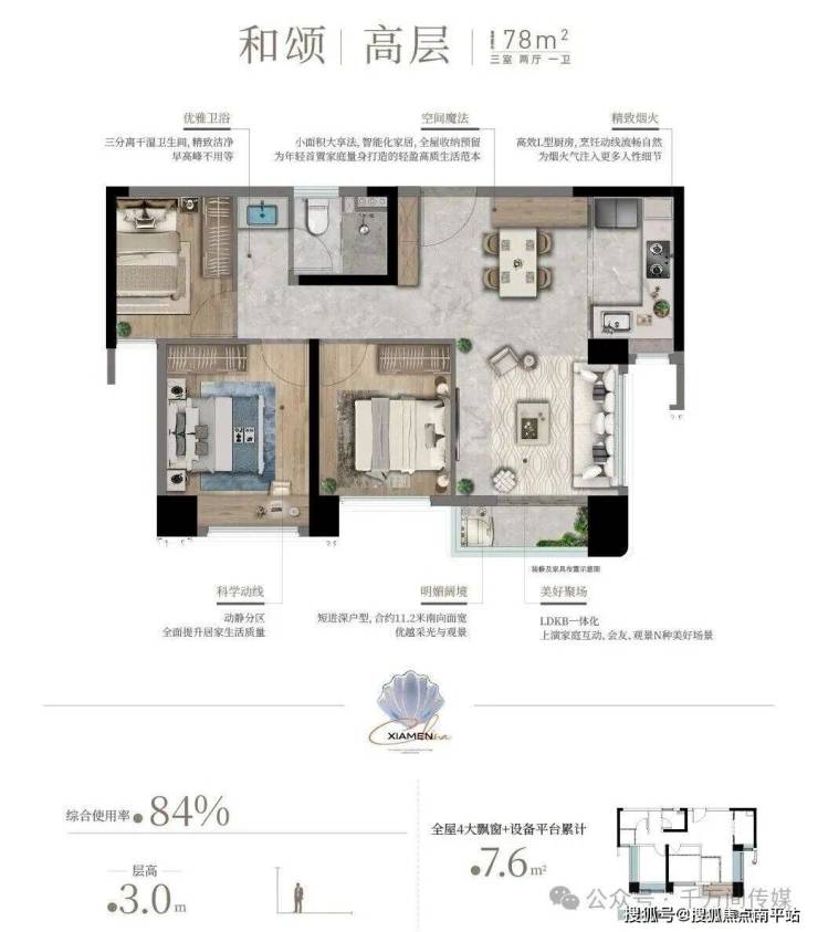 作为会展新城首个四代宅项目,海上雅颂 主推78-132㎡三至四房,覆盖刚需、改善需求,整体 得房率约84-107%。其中, 高层层高约3米,四代宅层高约3.1米,整个空间感会更通透。