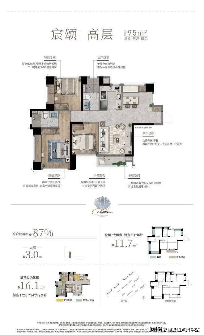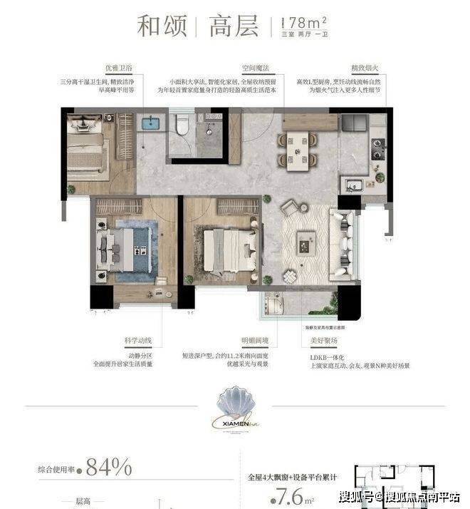 作为会展新城首个四代宅项目,海上雅颂主推78-132㎡三至四房,覆盖刚需、改善需求,整体得房率约84-107%。其中,高层层高约3米,四代宅层高约3.1米,整个空间感会更通透。
