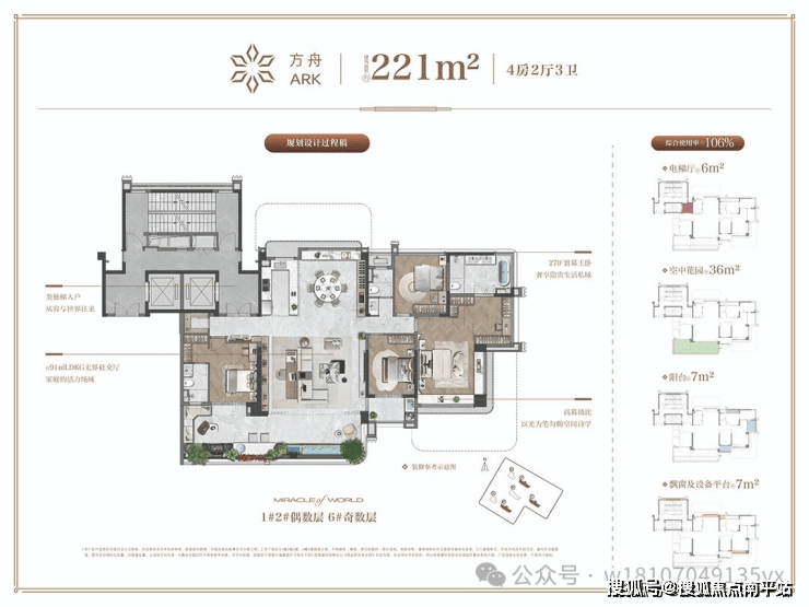 建面约221㎡户型: 阔绰尺度感再加码!搭配 约6㎡私属电梯前厅 ,彰显名门望族的归家礼序。