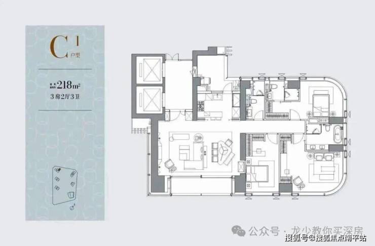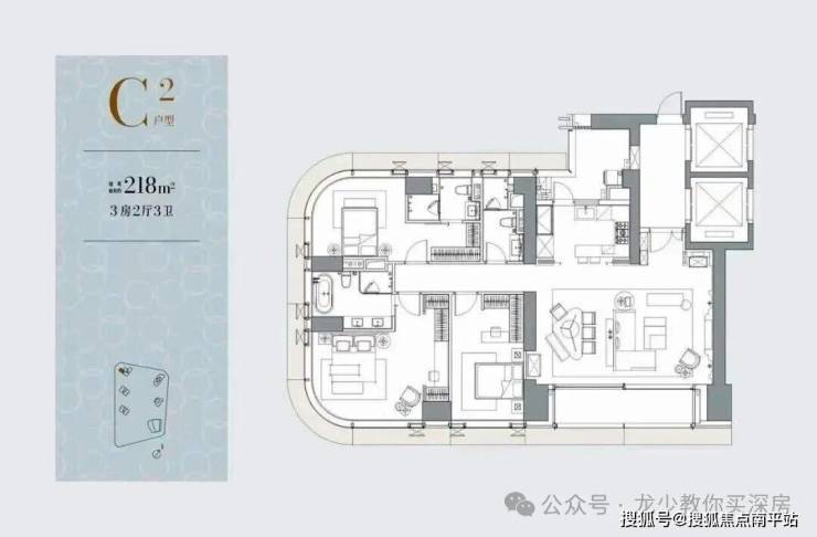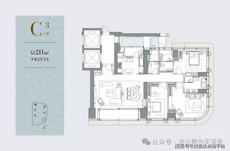 C栋/1-3栋(51层):4梯3户,层高3.3米,约211-218㎡(入门级3房+保姆间),位置靠里,朝西南向,海景视野会被达力地块和歌剧院遮挡。