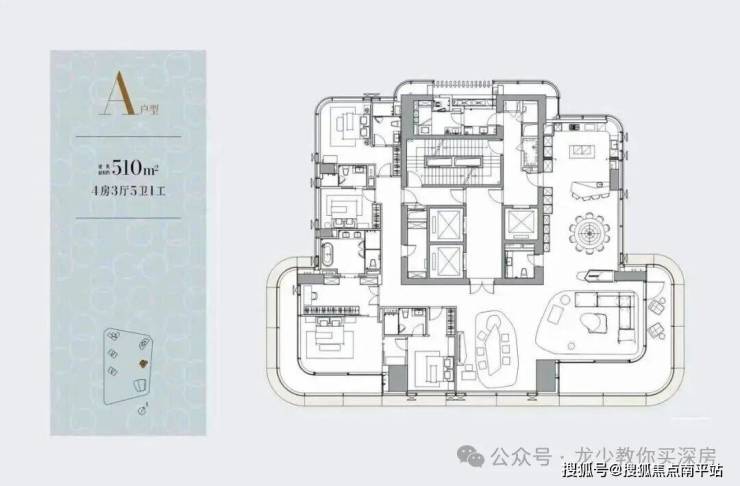 A栋/1-1栋(43层):3梯1户,层高3.6米,约512㎡(4房5卫+保姆套间),一层一户,私密性极致,为项目旗舰户型,享一线东南向无遮挡海景。