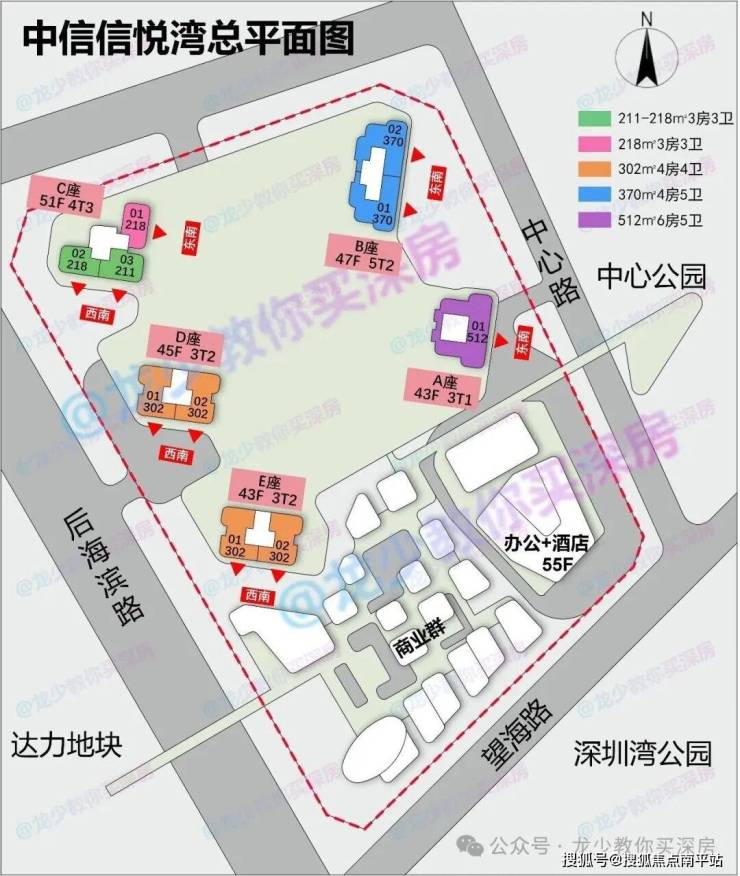 中信信悦湾共分两期,一期为住宅,二期为办公+酒店+商业。一期共有五栋43-51层超高层住宅,共403套211-217-302-370-512㎡大平层。户户朝南,可看海景。