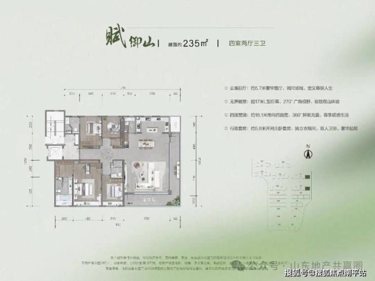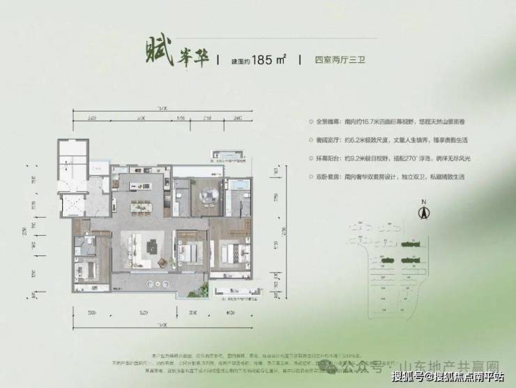 以极致产品造诣,臻筑4-8层约165-240㎡无界观山洋房,尊崇双玄关礼序,南向巨幕面宽,LDKG奢华通厅,行政级主卧套房,极目阔景阳台,270°浮岛瞰山等设计,颠覆济南墅居想象。