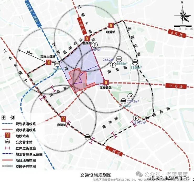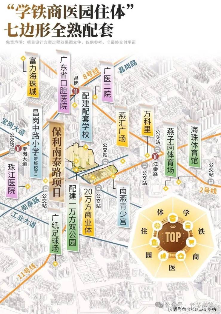 交通路网: 真正的三地铁交汇。步行约400米即达8号线宝岗大道站,未来北侧新增出入口后距离将缩短至300米;步行约900米可达2/8号线昌岗站;加上900多米的11号线,无论是去珠江新城、琶洲还是广州南站,都在半小时高效通勤圈内。