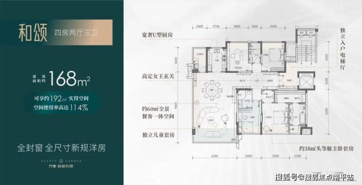 【四房两厅三卫】建筑面积约:168㎡;实得面积约:192㎡;实际得房率114%;相当于旧规226㎡!(旧规户型按85%得房率计算,仅供参考)