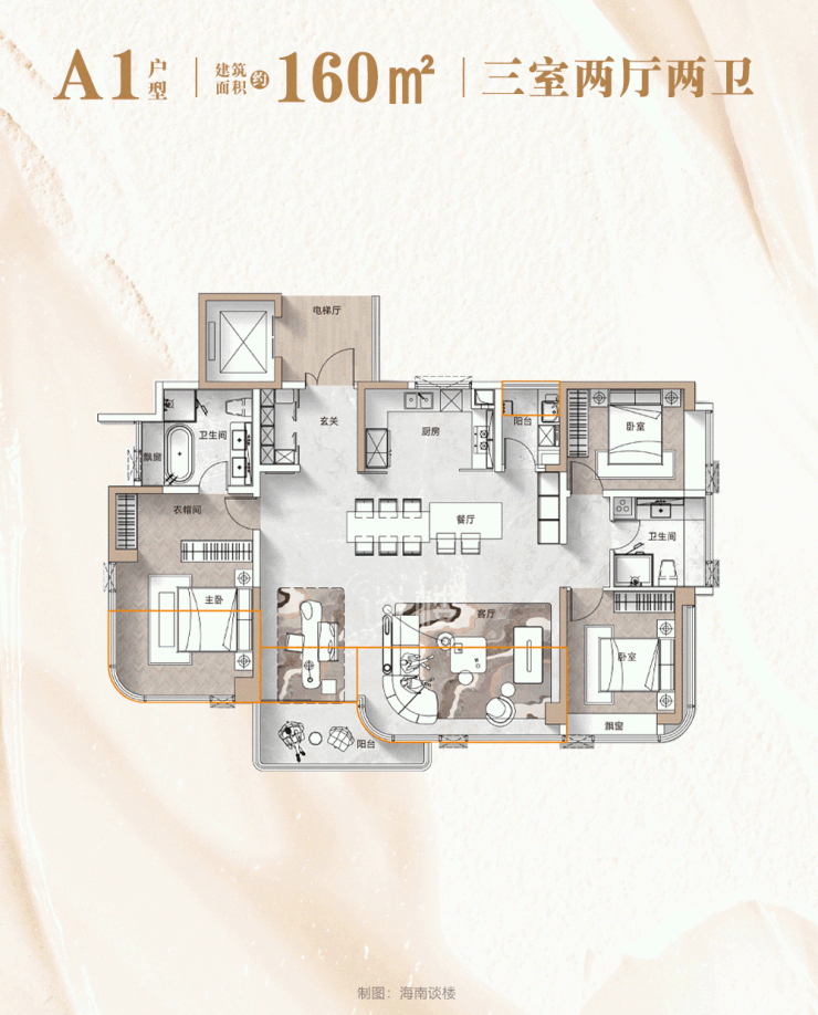 先看入门级160m²的三房户型,适配追求静谧舒适的三口之家或改善人群。