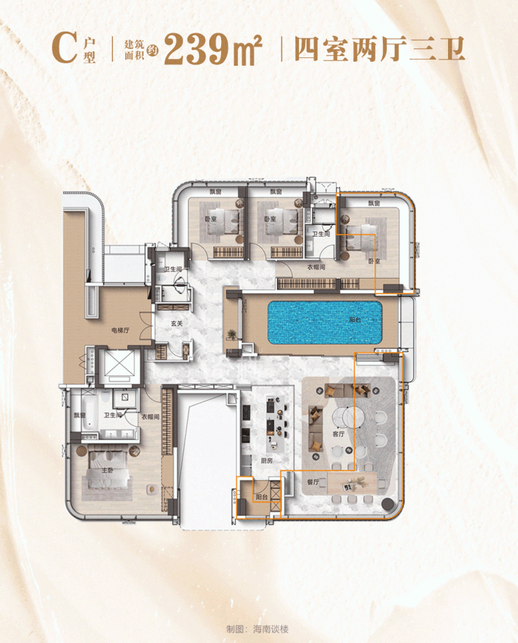 再来看看239m²超级大平层,以空中平墅的格局,将顶豪生活的奢华感、专属感与稀缺性推到了极致。