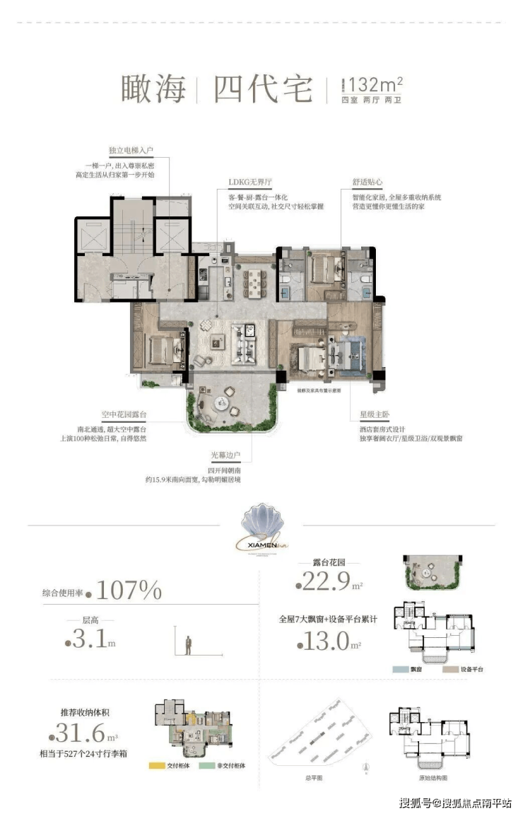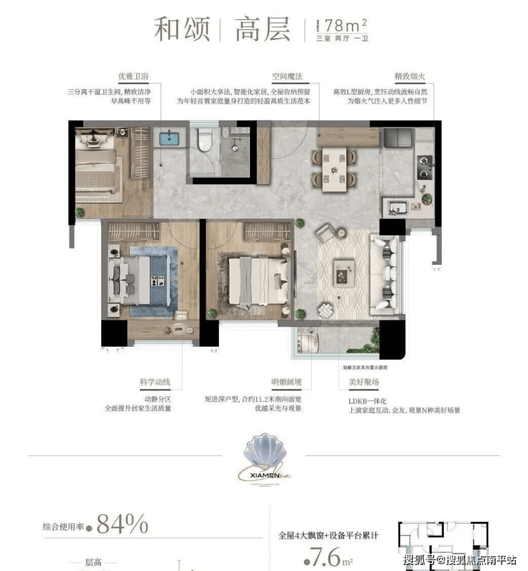 作为会展新城首个四代宅项目,海上雅颂主推78-132㎡三至四房,覆盖刚需、改善需求,整体得房率约84-107%。其中,高层层高约3米,四代宅层高约3.1米,整个空间感会更通透。