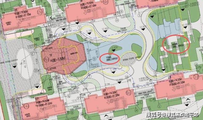 整体采用首层抬高设计,架空层高6.3米,景观上设置了景观坡地,依附坡地将打造多层水系景观,根据图中来看,水系面积规模不小,同时小区内部还设有多个集中小绿地,景观设置多元。