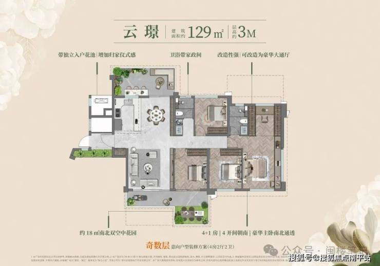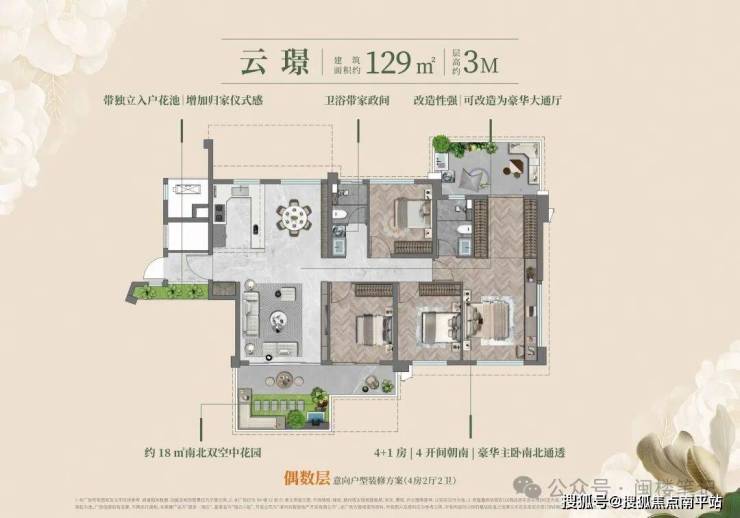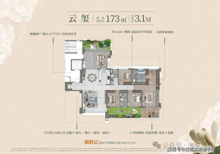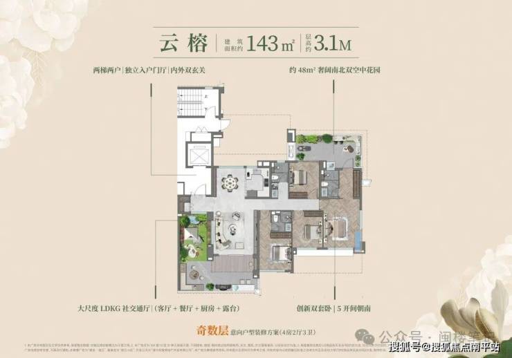 户户均为端套设计,全户型四开间及以上朝南,部分户型层高 3-3.1 米(高于传统住宅 2.8-2.9 米的标准);