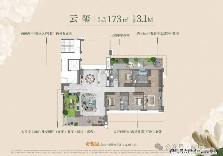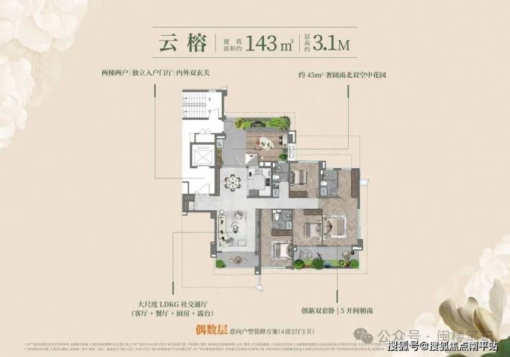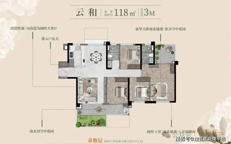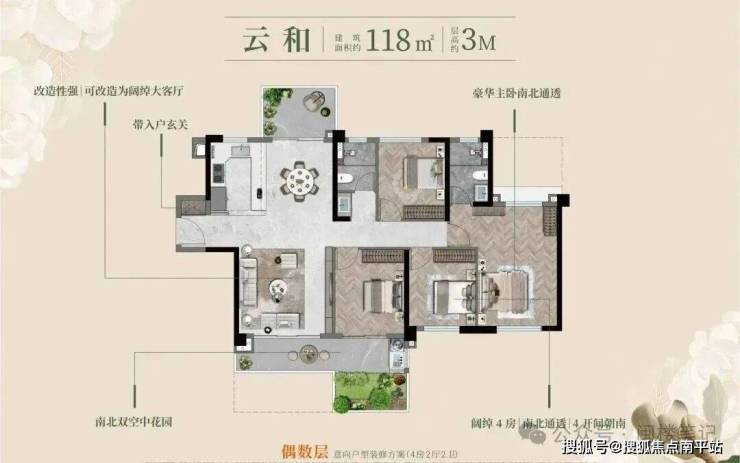 中大型户型侧重 “功能复合”:118㎡户型设计双花园入户(南北各一,合计赠送约 31㎡),可改造为 LDKB 一体化空间,主卧可衔接花园露台;143/170㎡大户型则强化 “大平层体验感”,空间改造灵活性较高。