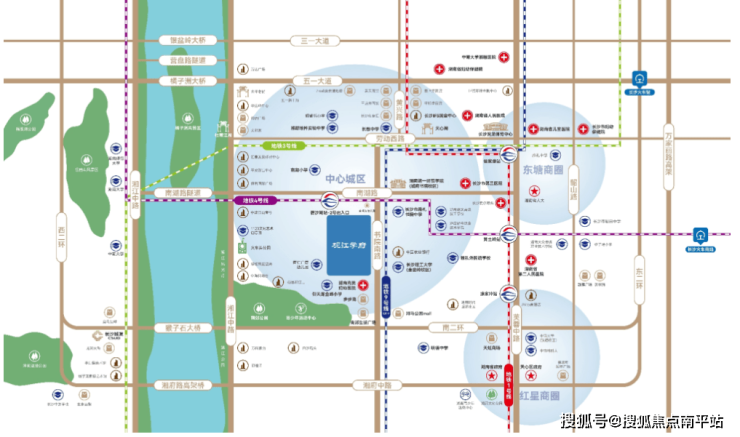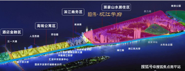②南湖新城,湘江东岸的璀璨明珠:长沙城发·南湖新城片区着力于打造“湘江东岸璀璨明珠”,总面积约5.02平方公里,是市委市政府“沿江建设、跨江发展”的重要片区,也是长沙市主城区的核心地带。集聚金融企业总部国家开发银行湖南省分行、湖南银行、长沙平安财富中心;汇聚高端商业汇景发展环球中心、长沙五矿广场、和立东升国际城市客厅;聚集了品质住宅保利国际广场、绿城凤起麓鸣、中海阅湘台等临江物业。