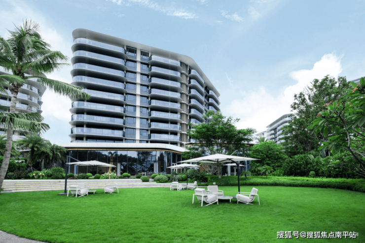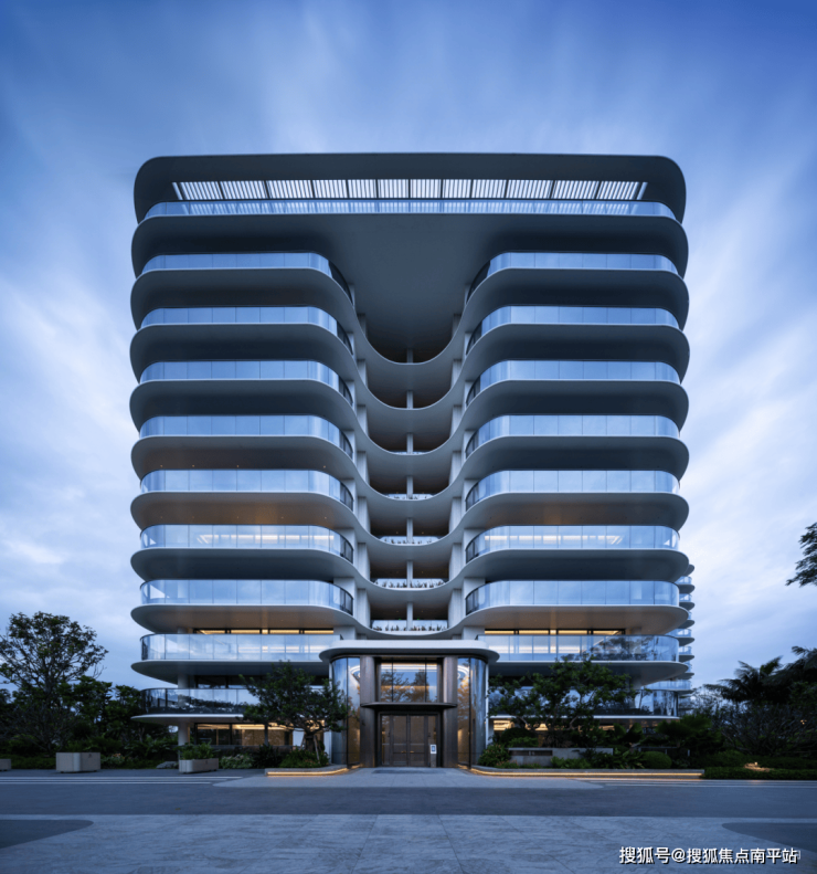 1.以三亚海岸为灵感,区别于常见的同质化/复制化设计,采用类公建化建筑形式区别于传统立面造型,以白色与灰色为主色系,通过铝板与玻璃所呈现的横向柔美线条,铝板层间线条采用创新弧形,紧扣“云端”与“海洋”母题,让建筑呈现出“云上花园之居,水上漂浮之所"的海洋灵动感。
