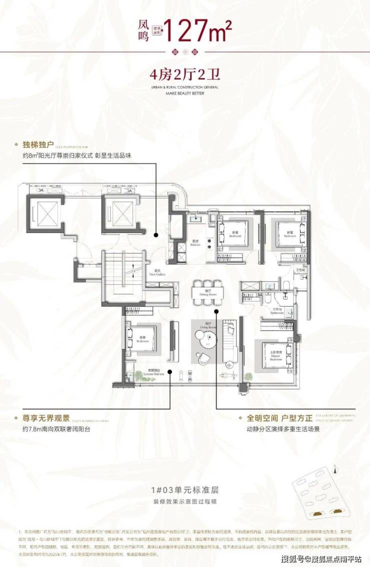 独梯入户,四开间朝南,约 7.8 米双联观景阳台,动静分区;精装交付,总价 500 万起,鼓台核心入门门槛。