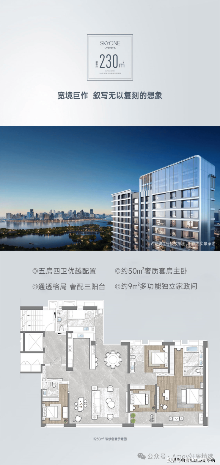 :143㎡户型有竖向通厅设计,南北通透,客餐厅分离,约 14.2 米南向湾景开间;230㎡湾海大平层户型方正南北通透,餐客双厅流线设计,有 2 米湾海宽境景观巨厅,南北双向景观视野。