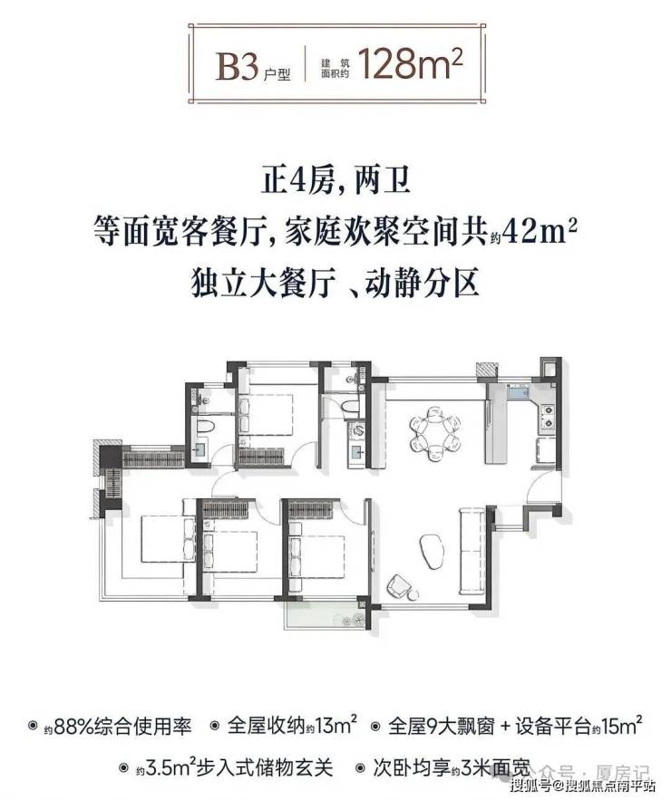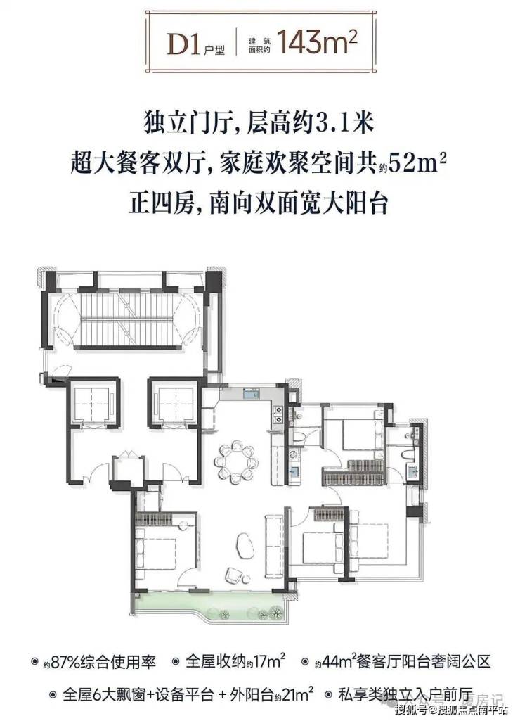 143㎡户型为类独梯入户搭配双阳台