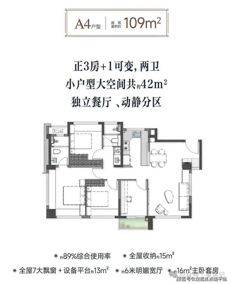 •104㎡户型有南向15米长真5面宽且卧室全朝南